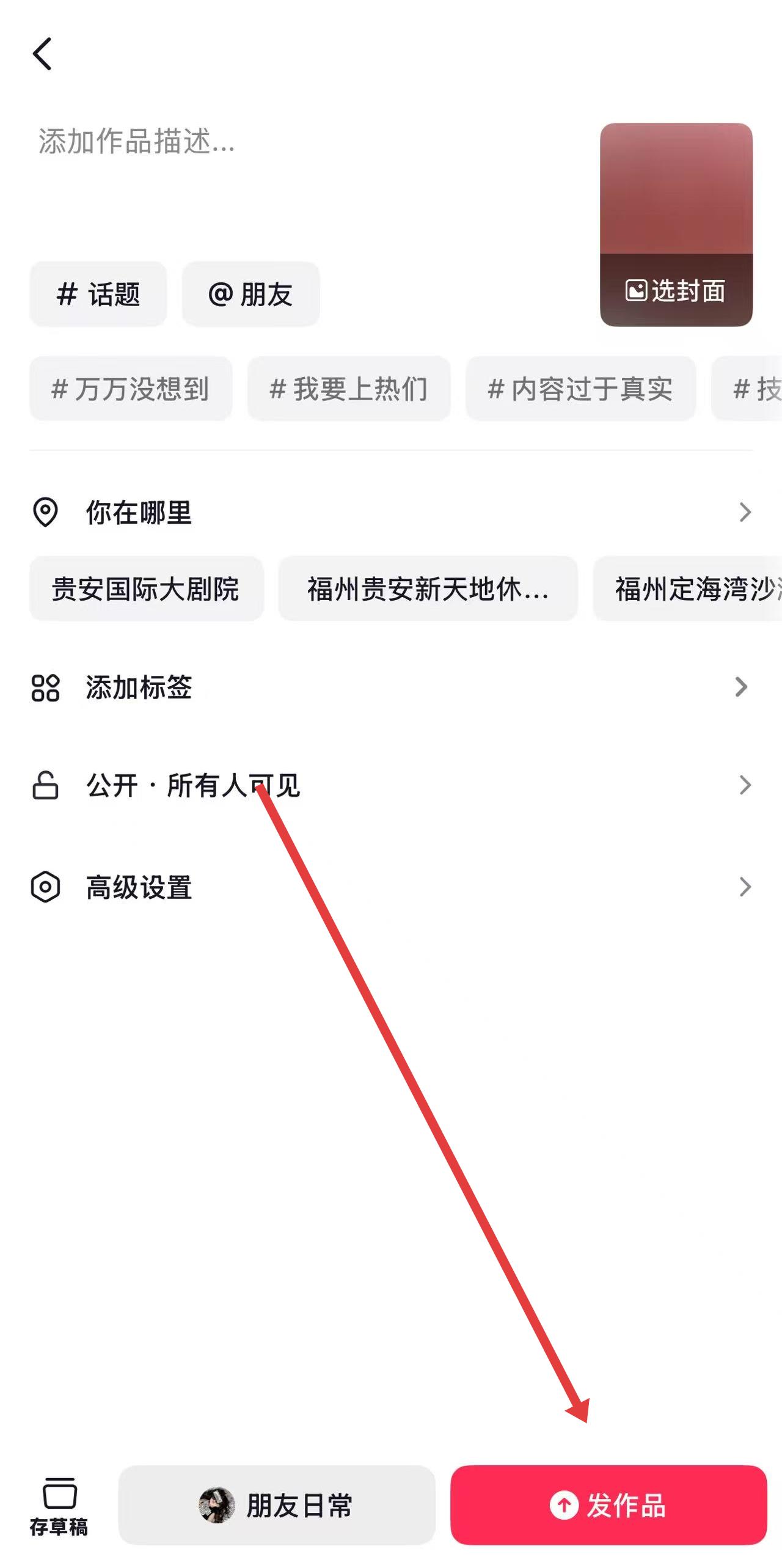 3、確認設置無誤,點擊發(fā)作品,即可將創(chuàng)作的內容發(fā)布到抖音平臺,分享給粉絲與其他用戶,開啟互動傳播。