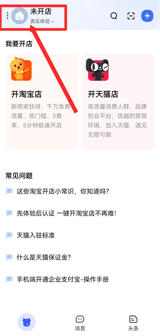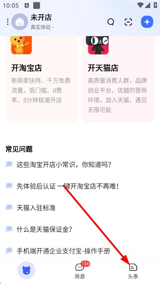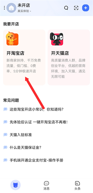 1、打開(kāi)千牛APP,在首頁(yè)點(diǎn)擊開(kāi)淘寶店,進(jìn)入淘寶開(kāi)店頁(yè)面。