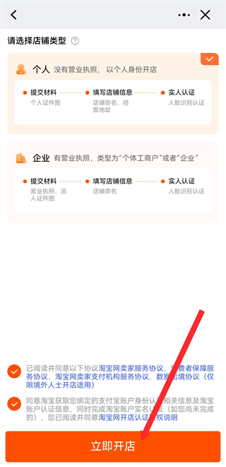 3、選擇店鋪類(lèi)型,勾選同意協(xié)議后,點(diǎn)擊立即開(kāi)店,按照提示完成開(kāi)店操作。