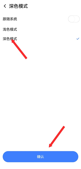 4、在深色模式設(shè)置頁(yè)面,選擇深色模式后點(diǎn)擊確認(rèn),完成設(shè)置。