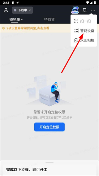 1、打開蜂鳥眾包APP,點(diǎn)擊右上角三個(gè)點(diǎn),在選項(xiàng)中點(diǎn)擊智能設(shè)備。