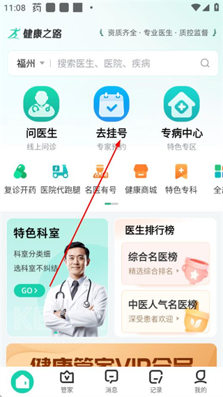 1、打開健康之路首頁,點擊去掛號選項,進入預約掛號頁面。