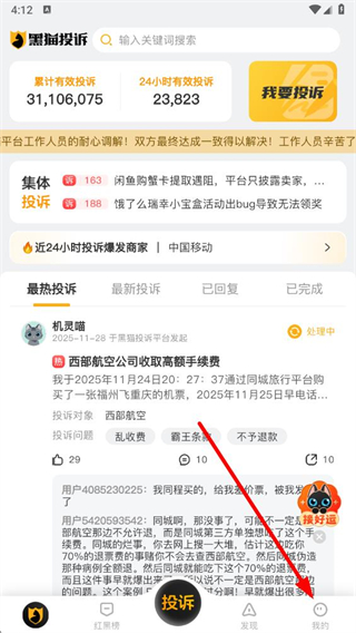1、打開黑貓投訴APP,在首頁點擊右下角我的選項。