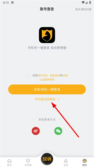 2、在賬號登錄界面,可選擇手機驗證碼登錄選項,切換至驗證碼登錄的操作頁面。