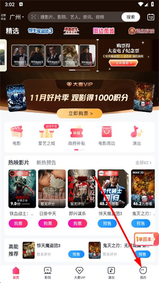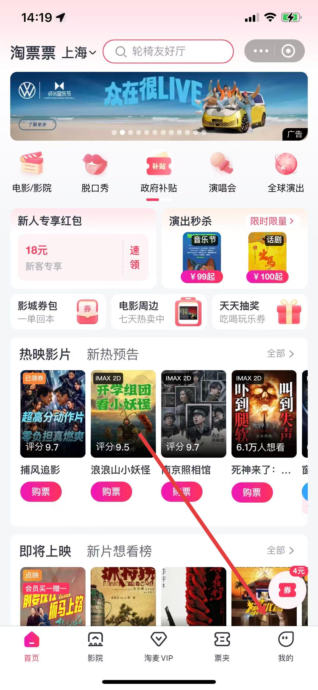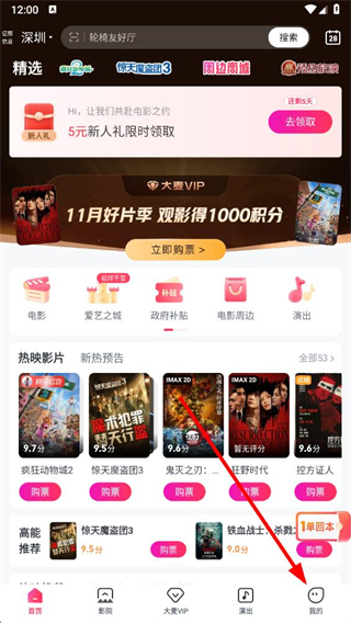 1、打開淘票票App,進入首頁,點擊底部導(dǎo)航欄中的我的。