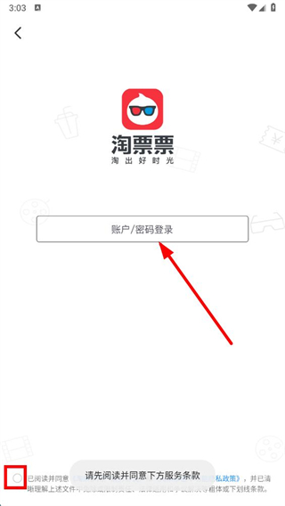 3、在登錄方式選擇頁面,勾選同意服務(wù)條款,點擊賬戶密碼登錄選項。