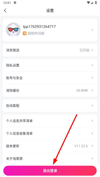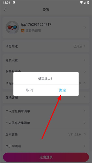 4、在提示框中點擊確定按鈕,即可完成淘票票賬號的退出登錄操作。
