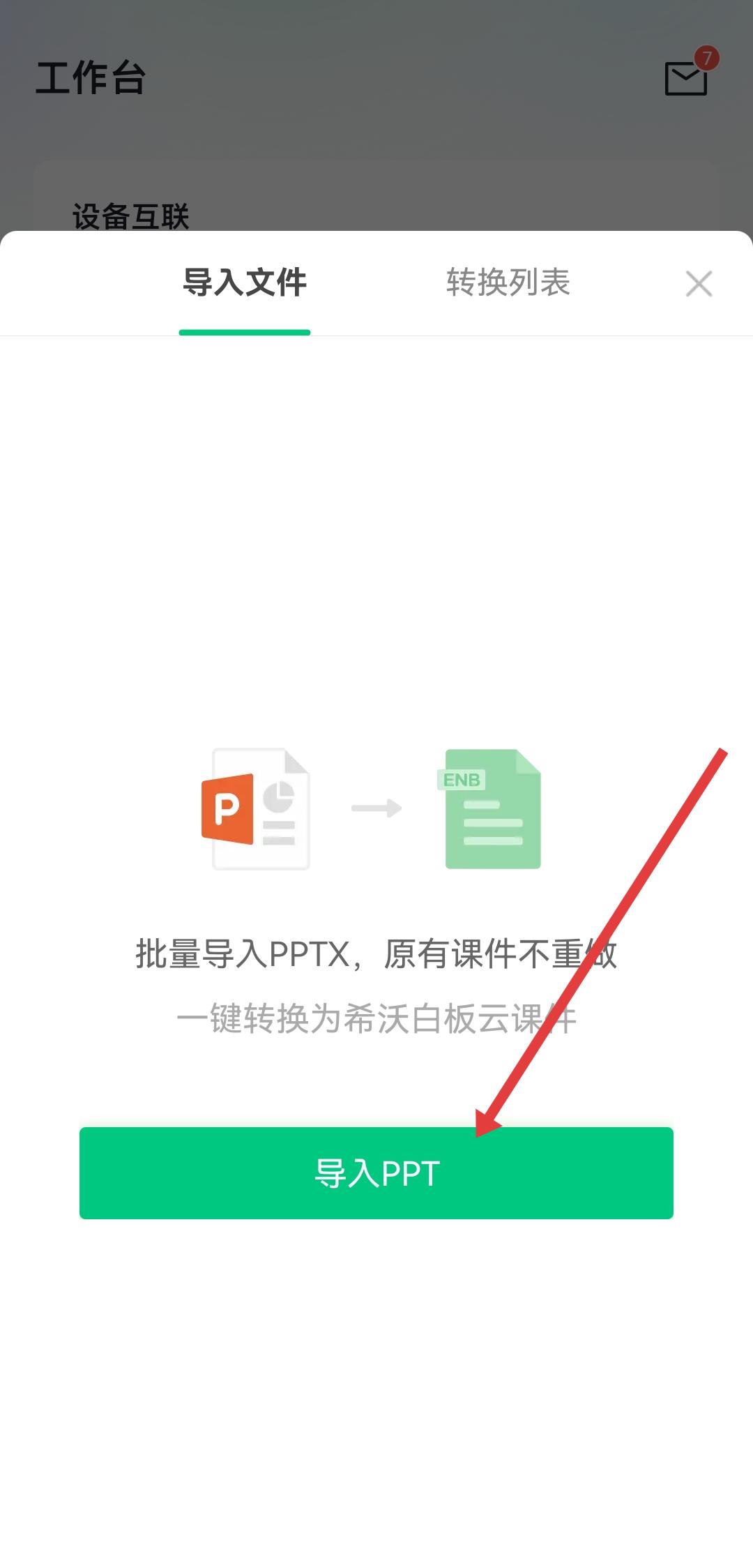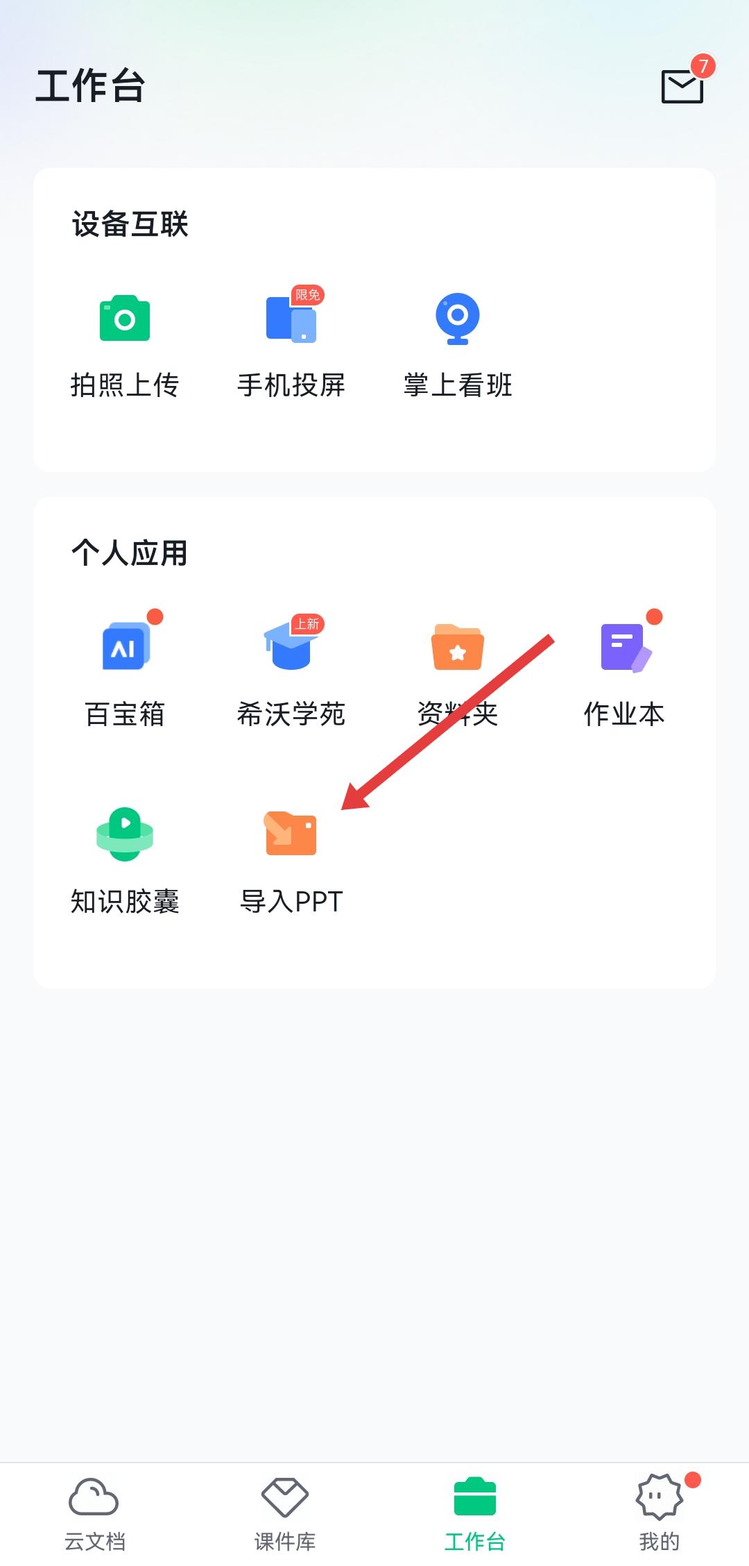 1、打開希沃白板APP,進入工作臺頁面,在個人應(yīng)用區(qū)域點擊導(dǎo)入PPT選項。