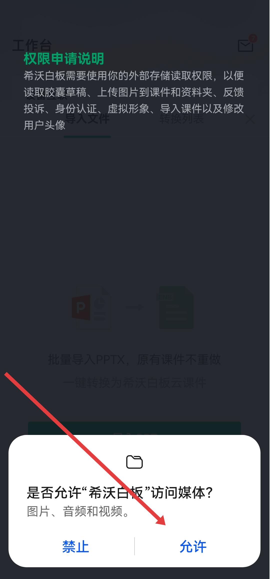 3、當(dāng)彈出是否允許希沃白板訪問媒體的權(quán)限提示時,需要點擊允許。