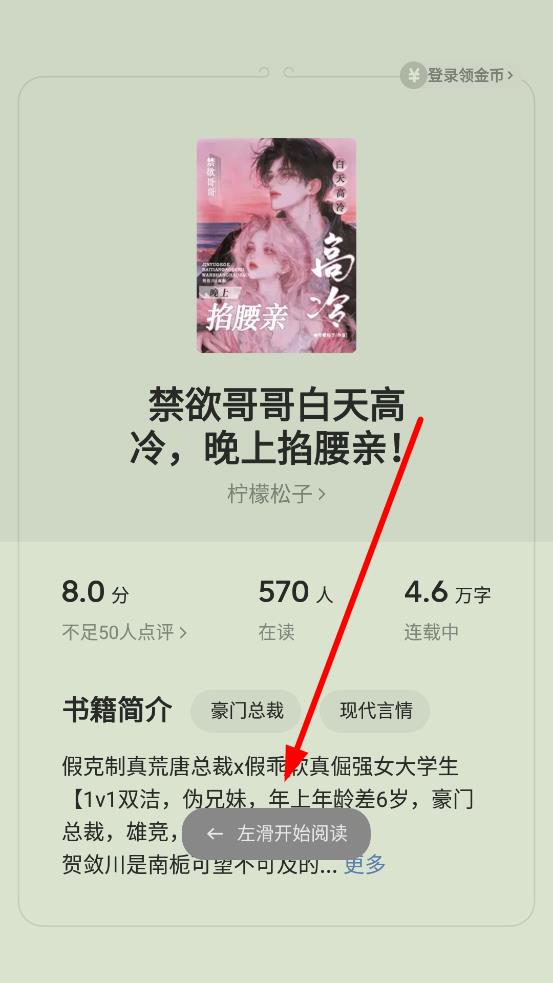 2、進(jìn)入小說(shuō)詳情頁(yè)左滑開(kāi)始閱讀,或點(diǎn)擊對(duì)應(yīng)閱讀按鈕進(jìn)入閱讀界面。