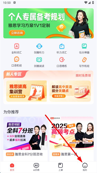 1、在高途雅思app首頁(yè),點(diǎn)擊右下角我的按鈕,進(jìn)入個(gè)人中心界面。