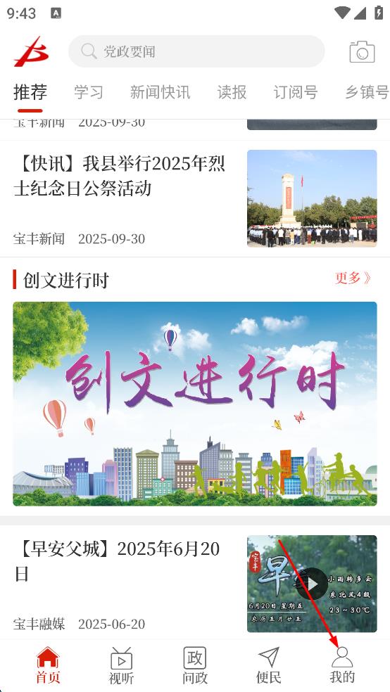 1、打開寶豐融媒App,進(jìn)入主界面后,點(diǎn)擊底部功能欄最右側(cè)我的選項(xiàng)。