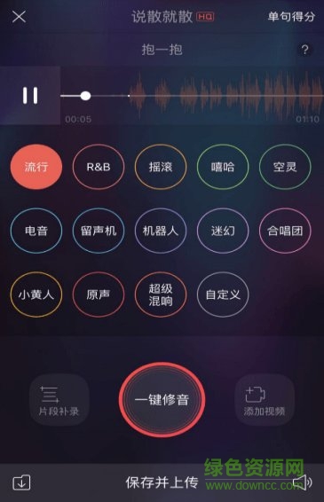 3、錄音結(jié)束后,回聽了一下剛才的內(nèi)容,發(fā)現(xiàn)有幾個(gè)地方明顯的走調(diào),以及高音唱不上去的問題,點(diǎn)擊“一鍵修音”按鈕,對演唱的內(nèi)容開始修復(fù),浮層提示進(jìn)度填滿100%后,表示修音完成。