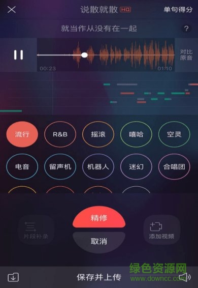 7、如果用戶對剛才一鍵修音后的內(nèi)容不滿意,直接點(diǎn)擊錄音結(jié)束頁的“精修”按鈕,進(jìn)入精修頁。通過自由選擇精修頁的“輕度修音”、“中度修音”、“重度修音”等方式,手動(dòng)修音,也可以選擇單句歌詞不修音,保留自己的原聲。
