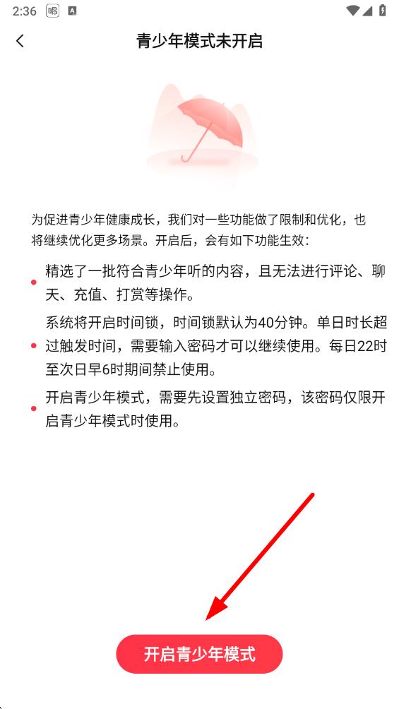 5、在青少年模式頁面,點(diǎn)擊開啟青少年模式,按照提示設(shè)置獨(dú)立密碼后,即可成功開啟。