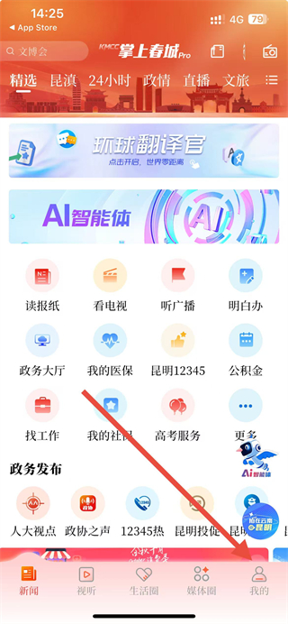1、打開掌上春城APP,點(diǎn)擊底部我的選項(xiàng),即可進(jìn)入個(gè)人頁面。