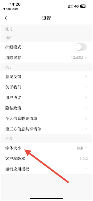 3、在設(shè)置頁面點(diǎn)擊字體大小選項(xiàng),彈出設(shè)置字體大小的滑塊。