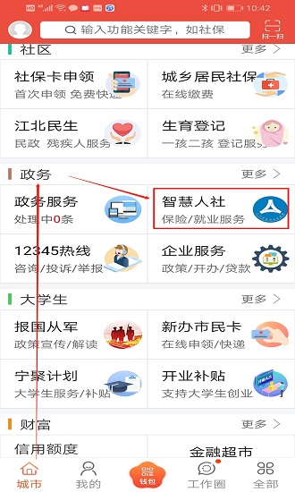 1.進(jìn)入軟件后,在下方菜單欄中找到“城市”-“政務(wù)”-“智慧人社”