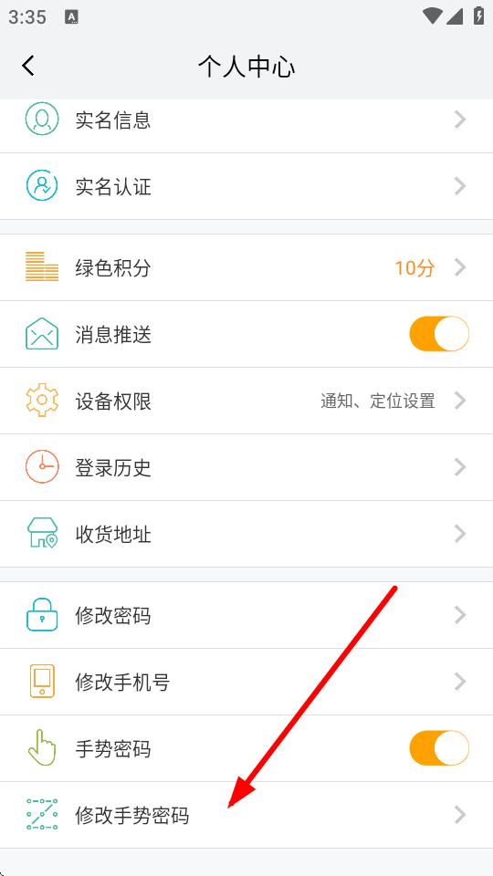4、在個(gè)人中心頁面里,找到并點(diǎn)擊修改手勢密碼選項(xiàng),然后按照提示操作,繪制新的手勢密碼并確認(rèn),即可完成修改。