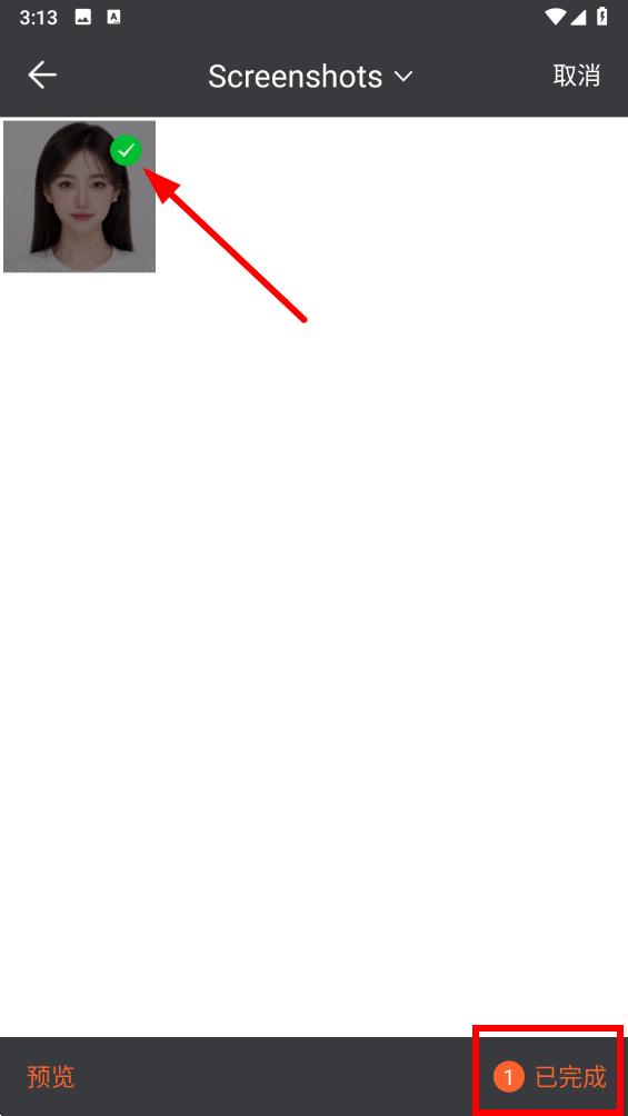 2、進(jìn)入照片選擇界面,從相冊中選取需要修改尺寸的證件照,點擊已完成確認(rèn)選擇。