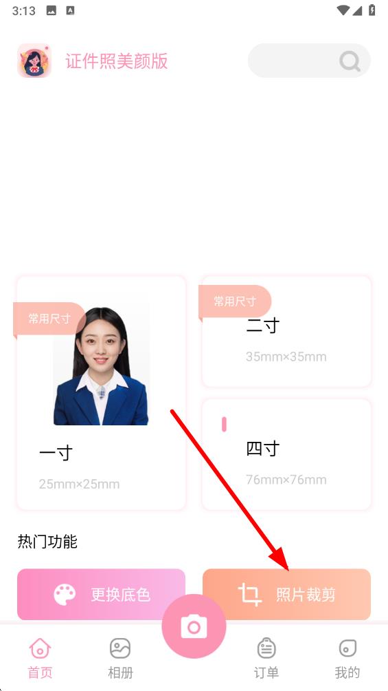 1、打開證件照美顏版APP,在首頁熱門功能區(qū)域,點擊照片裁剪按鈕。