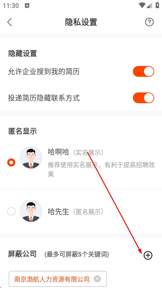 3、進入隱私設置頁面后,下滑找到屏蔽公司選項,點擊+號按鈕。