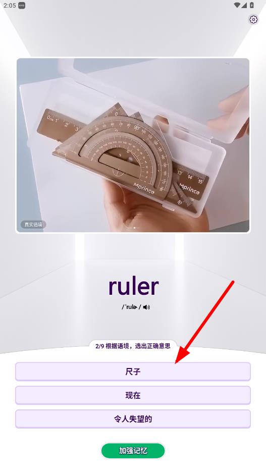 2、進(jìn)入學(xué)習(xí)頁面后,根據(jù)所展示的單詞和真實(shí)語境,從選項(xiàng)中選出正確意思。