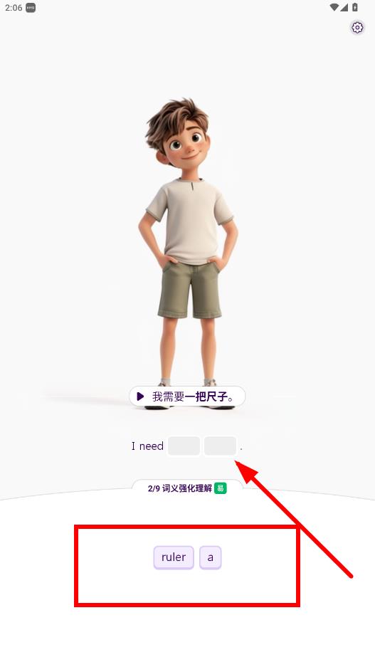 3、在語義強(qiáng)化理解環(huán)節(jié),將下方詞匯拖入空白處完成句子,如我需要一把尺子對(duì)應(yīng)I need拖入a和ruler。