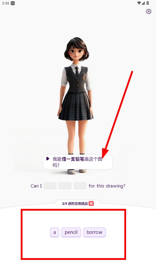 4、在進(jìn)階應(yīng)用挑戰(zhàn)部分,同樣把下方的詞匯拖入空白處,完成句子填空,比如針對(duì)我能借一支鉛筆畫這個(gè)圖嗎?,拖入borrow、a、pencil。