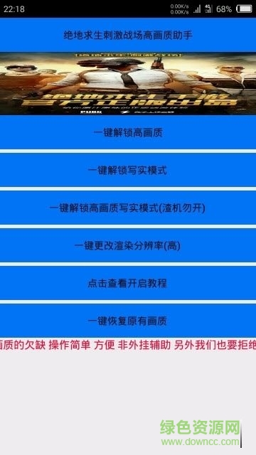 絕地求生刺激戰(zhàn)場高畫質(zhì)助手是能夠提高絕地求生刺激戰(zhàn)場游戲畫質(zhì)的軟件,高清晰度的游戲畫面不僅僅能提升你的游戲體驗(yàn),同時(shí)還能方便你盡快的觀察到身邊的敵人,保護(hù)自身的安全,需要的用戶快來綠色資源網(wǎng)下載吧!