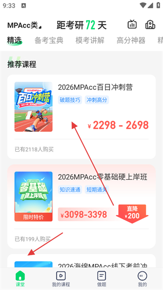 1、在課堂頁面,提供豐富的MBA備考課程,像2026MPAcc百日沖刺營等,覆蓋不同備考階段與需求,助力考生掌握破題技巧。