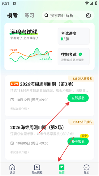 3、在做題板塊,有模考和練習(xí)功能,例如2026海綿周測等,可報(bào)名參與模考檢驗(yàn)學(xué)習(xí)成果,還有往期考試視頻解析幫助清除知識(shí)弱點(diǎn)。