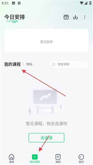 2、進(jìn)入我的課程頁面,可查看已有的課程安排,若暫無課程,能點(diǎn)擊去選課挑選適合自己的課程。
