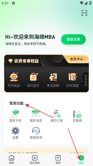 4、我的頁面里,有登錄注冊入口,方便用戶登錄,還有會(huì)員專享權(quán)益、溫故卡包、我的消息等常用功能,為備考提供多方面輔助。