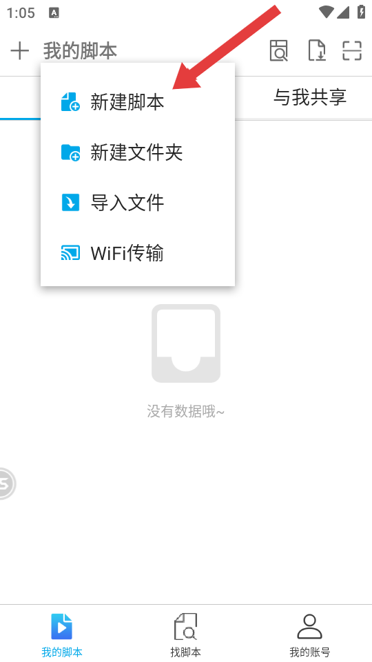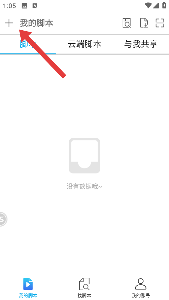 1、在觸動(dòng)精靈我的腳本界面,點(diǎn)擊左上角的+按鈕,彈出操作選項(xiàng)菜單。