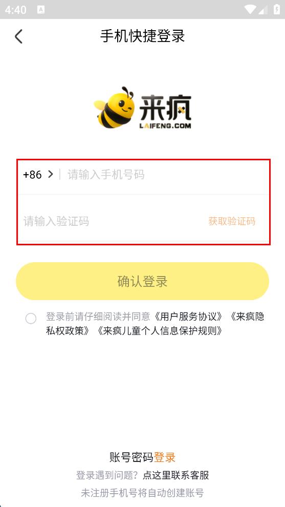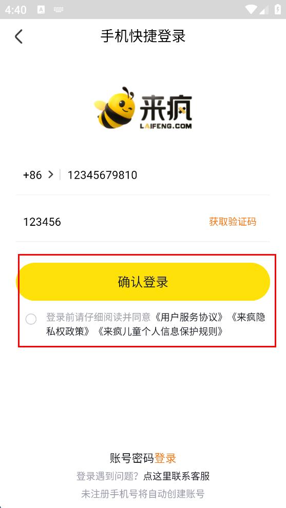 4、輸入好手機(jī)號(hào)和驗(yàn)證碼后,勾選登錄前請(qǐng)仔細(xì)閱讀并同意協(xié)議,最后點(diǎn)擊“確認(rèn)登錄”按鈕,完成來瘋軟件的手機(jī)快捷登錄操作。