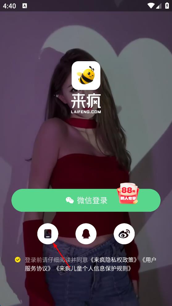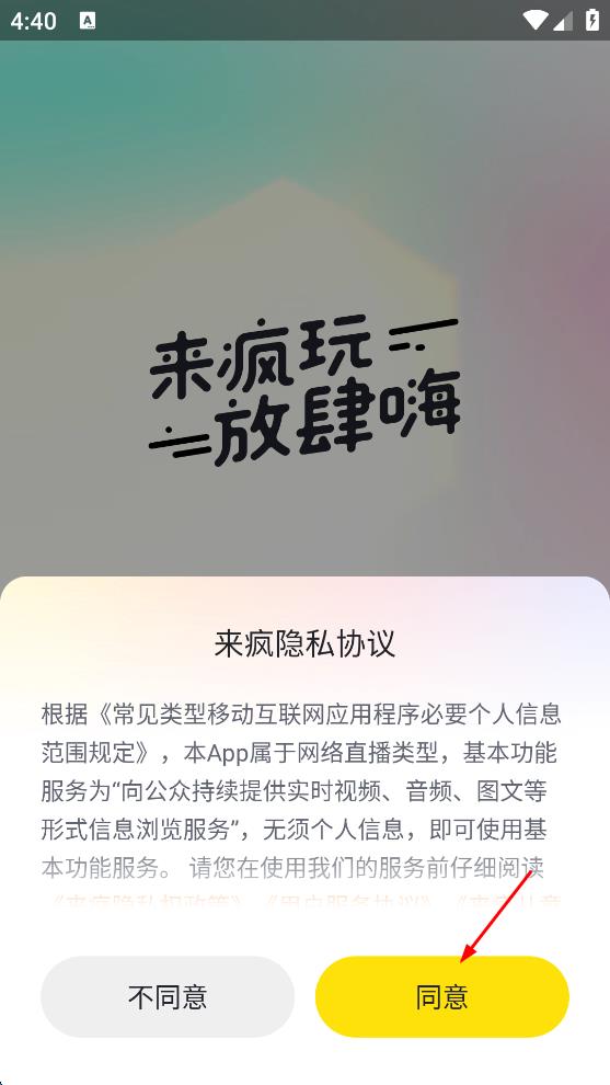 1、打開來瘋軟件,彈出“來瘋隱私協(xié)議”提示彈窗,閱讀相關(guān)內(nèi)容后,點(diǎn)擊“同意”,進(jìn)入登錄選擇頁面。