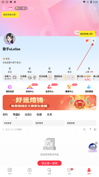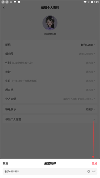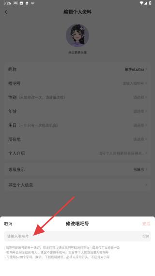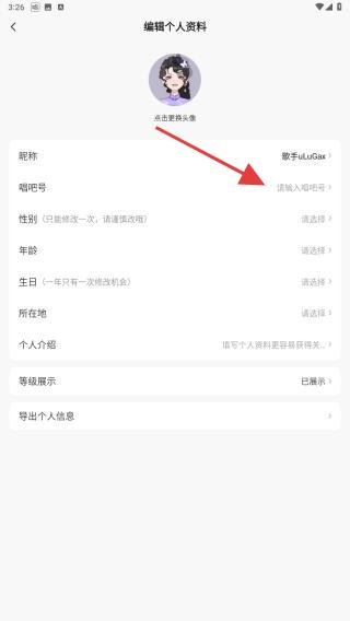 2、在編輯個人資料中,用戶需找到并點擊唱吧號,位于昵稱下方。