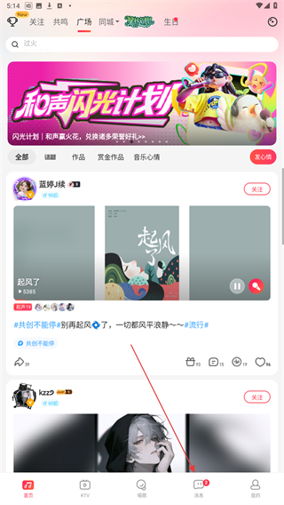 1、啟動唱吧k歌的應(yīng)用軟件,點擊首頁下方消息的圖標。
