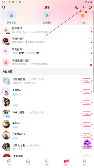 2、進入消息的頁面內(nèi),點擊右上+的功能按鈕。