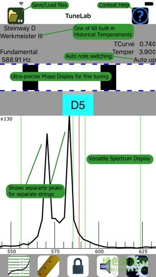 1.TuneLab有兩個(gè)不同的顯示屏,可以同時(shí)看到。一個(gè)是相位顯示。這是一個(gè)黑色方塊向左或向右移動(dòng)的樂(lè)隊(duì)。你調(diào)整,使廣場(chǎng)停止移動(dòng)。另一個(gè)是頻譜顯示。這是一個(gè)圖表,顯示了聲音中存在的每個(gè)音高的頻譜峰值。您調(diào)整為使圖形中的峰值移動(dòng)到中心紅線。頻譜顯示可以無(wú)噪聲地進(jìn)行粗略調(diào)諧,因?yàn)槊恳粋€(gè)同音串都會(huì)在圖中產(chǎn)生自己的峰值。同時(shí)顯示相位顯示和頻譜顯示可以讓您更全面地了解調(diào)諧情況,而不是單個(gè)旋轉(zhuǎn)型或針型顯示器。