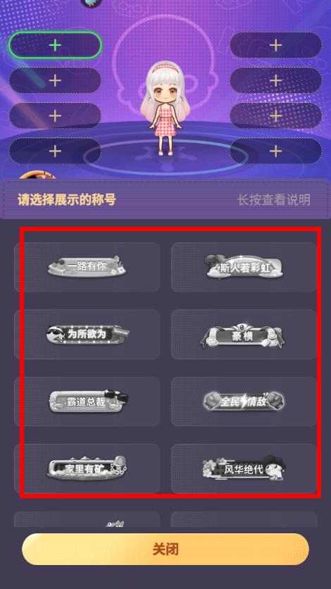 4、在稱號選擇界面,瀏覽展示的稱號,點(diǎn)擊想要設(shè)定展示的稱號即可完成選擇,選好后點(diǎn)擊關(guān)閉。