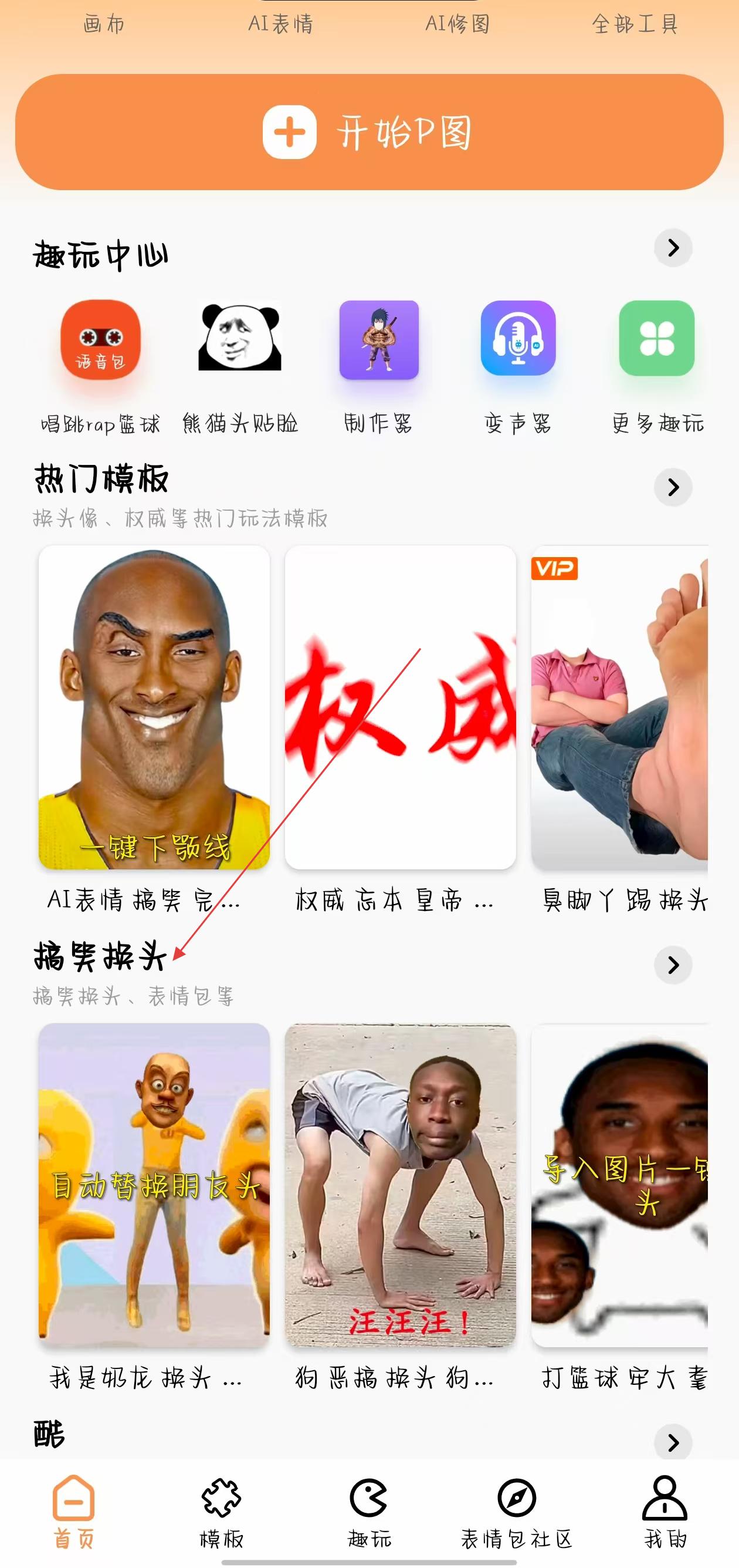 1、打開暴走P圖App進(jìn)入首頁(yè),在趣玩中心下方找到搞笑換頭選項(xiàng)并點(diǎn)擊進(jìn)入換頭操作界面。