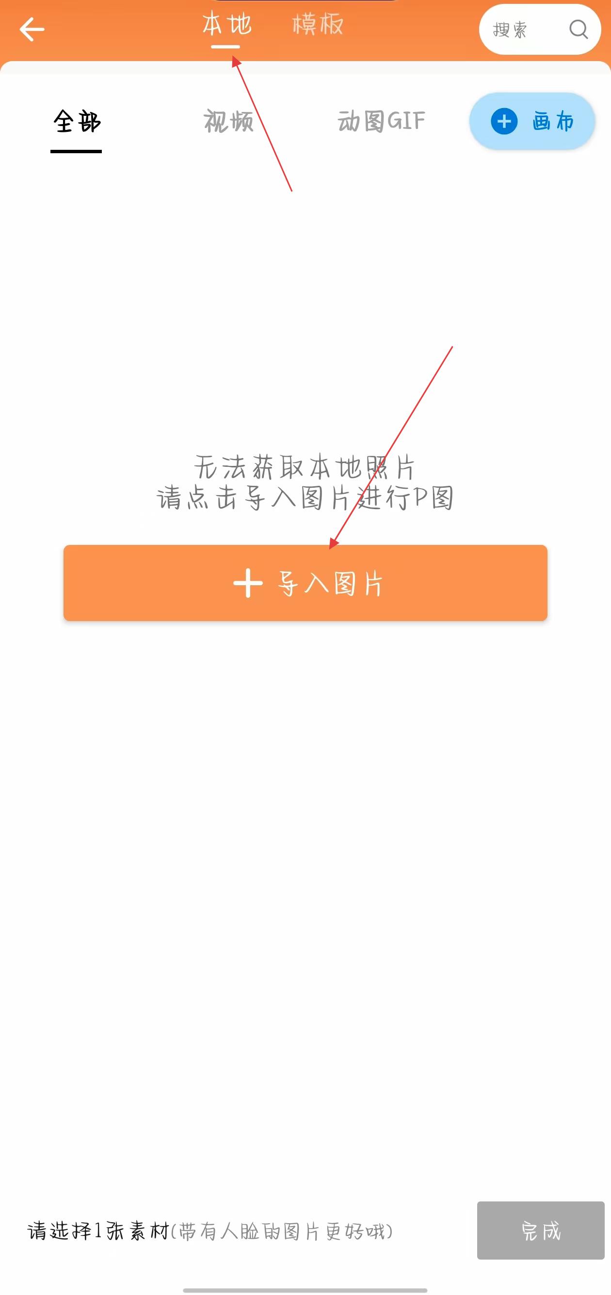 2、進(jìn)入換頭界面后,點(diǎn)擊上方本地選項(xiàng),再點(diǎn)擊導(dǎo)入圖片按鈕,從手機(jī)相冊(cè)中選擇想要進(jìn)行換頭操作的圖片。
