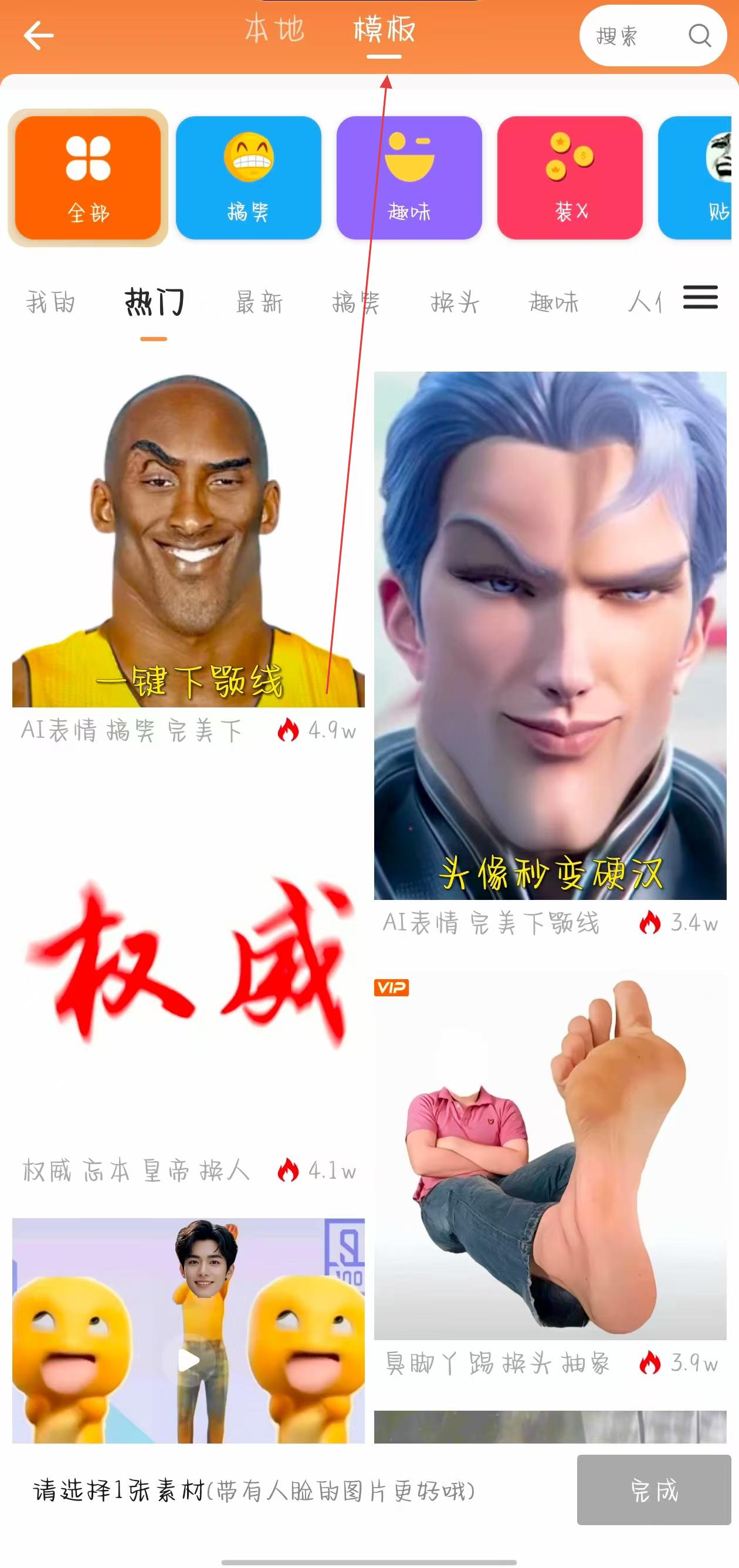 3、要是不想用本地圖片,也可以點(diǎn)擊上方模板選項(xiàng)卡,從App提供的熱門、搞笑等分類模板中挑選合適的模板圖片。