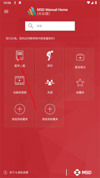 1、打開默沙東診療手冊大眾版app,在首頁點擊醫(yī)學主題選項。