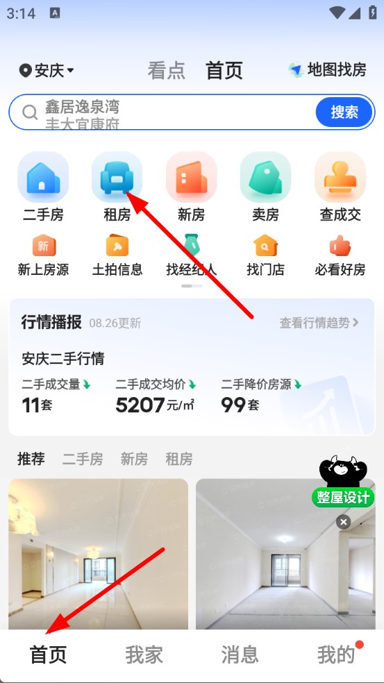 1、打開貝殼找房APP,進入「首頁」,點擊「租房」圖標。
