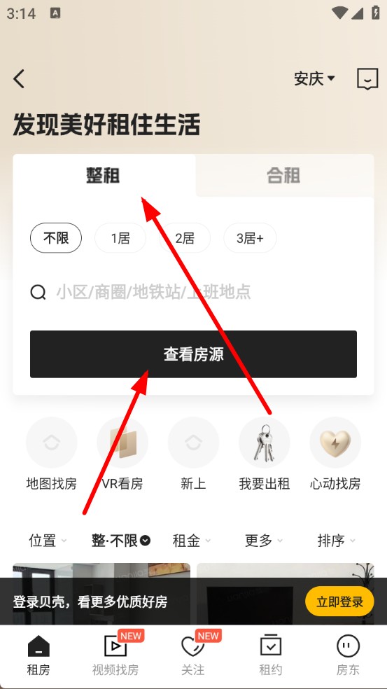 2、進入租房頁面,選擇「整租」,設置房間數(shù)量,點擊「查看房源」。