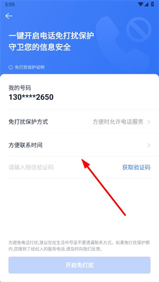 4、在頁面設置免打擾保護方式、方便聯(lián)系時間,輸入短信驗證碼后點擊開啟免打擾按鈕。