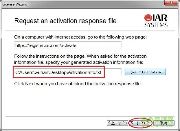 22.我們在回到軟件注冊界面(如圖位置),點(diǎn)擊“下一步”(框起來的地方如果指向不對,可以點(diǎn)擊“Open file location”選擇“ActivationInfo.txt”)